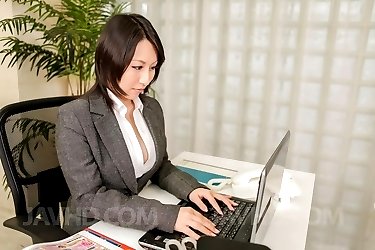 Yuuna Hoshisaki shows cleavage and strokes cocks at the office